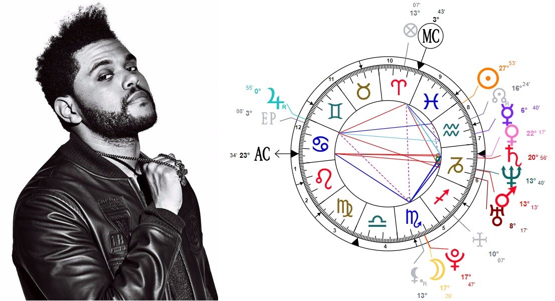 Another fascinating part of his chart is his Ascendant, which is in shy and emotional Cancer (an aspect which I believe contributes strongly to his artistic talent). The downside of this placement is that people with strong Cancerian energy tend to associate love with pain, as much as they are incurable romantics. In addition to this, his Ascendant is conjunct the asteroid Chiron, or the Wounded Healer Archetype. This means that he attracts a fair amount of painful experiences in his life, but also opportunities to heal others with his emotions, even if he might feel like he is not emotionally nourished by those very people he attracts and is attracted to. Moreover, his Chiron and Ascendant are loosely conjunct Jupiter which is placed in the 12th house the house of self-undoing, sacrifice, bed pleasures and secrets. This is also the house of creativity and the imagination, and whoever has Jupiter placed here always gets second chances from the Universe, from spirits and unseen benefactors. It’s almost as if the Weekend has this strong magnetic forcefield around him that attracts all sorts of dark experiences but he is offered spiritual protection as long as he keeps creating art from said experiences. To be honest, with a Saturn in the 6th house he will be continuously pressured into working in the service of others, while also being kept in stable health in spite of his self-destructive tendencies. So, I see an individual who needs to make sense of life in some form through the use of entertainment and his romantic liaisons. I see that he carries within a tendency to serve his romantic partners while not truly understanding his personal boundaries. He wears his heart on his sleeve but he does it too quickly and much too intensely. This could breed resentment in his close partnerships, because if his needs are not met as fast as he meets those of others, and if he doesn’t learn to communicate clearly with others, he might become emotionally explosive due to build-ups that could destroy his long-term relationships in a matter of seconds.