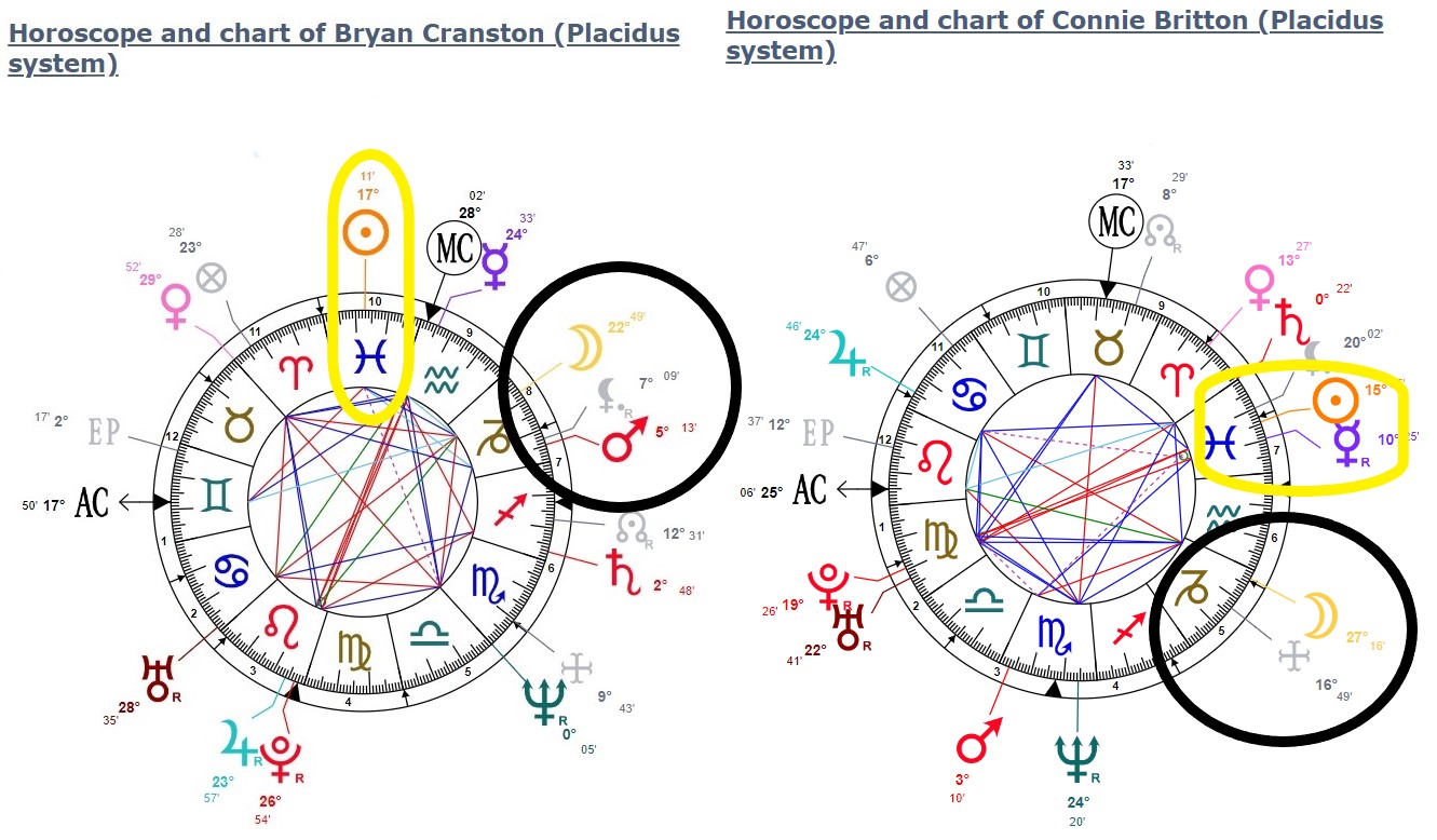 Another fascinating aspect is that although Connie has her Sun conjunct Lilith, Brian has his Moon conjunct Lilith! This offers Connie a confident intensity that might intimidate her peers and it offers Brian a darker emotionality which translated so well in his role as Walter White, the man who literally finds himself in the claws of Lilith’s ruin; overcome by his inner darkness, he becomes bad to the bone. This aspect is amplified in Brian’s chart by the fact that his Moon sits in the darkest house of the zodiac (the 8th house) and it is also joined by Mars, the God of War, the red planet of sexuality and aggression. So don’t believe the hype! Brian might not be the good guy next door that he pretends to be in his interviews (and judging by his friendly and intelligent Gemini Ascendant), since behind that competent façade lies an individual with amazing survival instincts and quite an impressive sexual appetite. Paired with the Piscean fertile imagination and capacity to hold secrets and endure physical pain, I can only imagine the depths of Brian’s sexual prowess. While for Connie, her lunar light is more moderate since it is joined only by the Vertex, a point which is linked to the fated events that will be continuously discharged in a person’s life throughout their life. Seeing as this placement is in the work-prone 6th house, Connie is emotionally attached to her work and she will have a lot of karma to process with the people she works with and with the way she handles her daily routine, her personal responsibilities and her health.