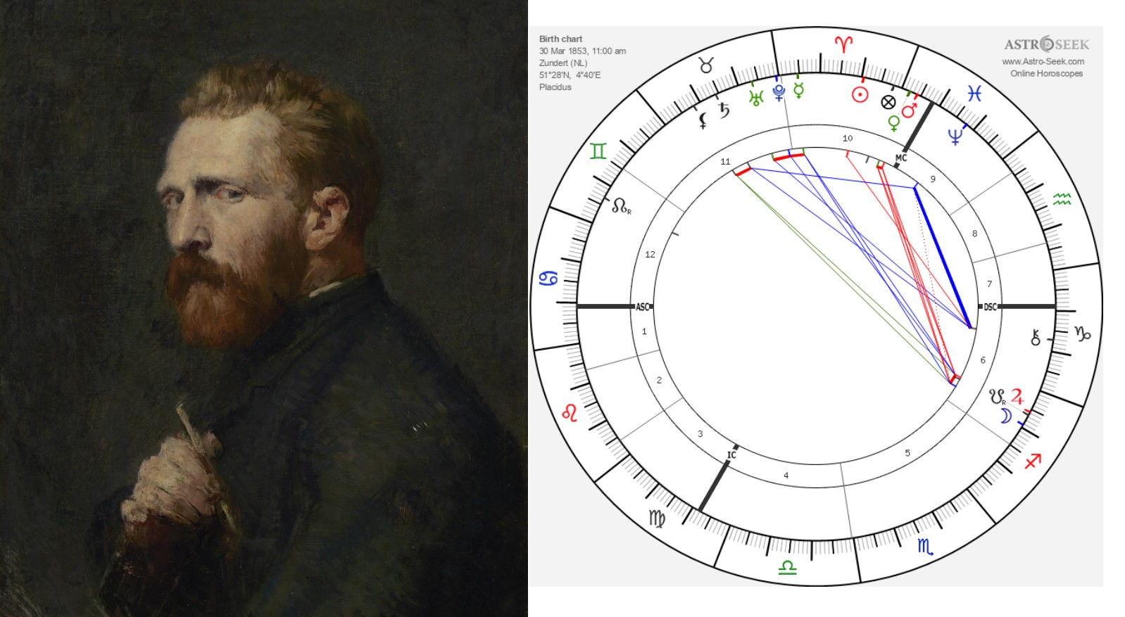 Self-portrait of the artist & birth-chart of Dutch painter, Vincent Van Gogh taken from https://www.astro-seek.com/birth-chart/vincent-van-gogh-horoscope