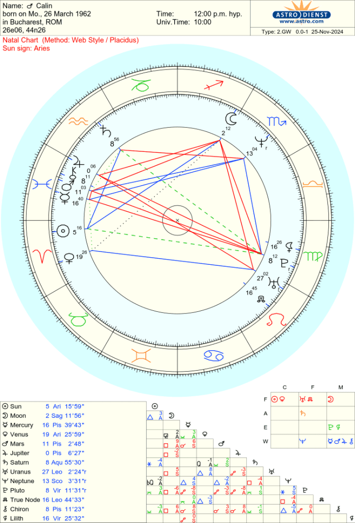 On the other hand, Lasconi’s opponent, Georgescu was born on the 26th of March 1962 in Bucharest. He is a Sun in Aries (so a natural and slightly belligerent leader) with a Moon in Sagittarius (a placement he shares in common with Trump). He describes himself as a patriot but considering that he has a lunar placement in the least domestic and settled sign of the zodiac, Sagittarius, Georgescu is actually more emotionally attached to travelling, to his connections to foreigners, and to the philosophy and religion of a specific culture rather than to its daily habits, rites and the customs of everyday people; in the same vein as a man who promises commitment just to get you to sleep with him, and then he packs up and leaves, I see here a great potential to be ardently courted during the campaign only to be left abandoned once he reaches the presidency (and guess to whom he is ready to ‘give’ some territory?? c’mon have a naughty go) In addition to such passionate and fiery placements which would indeed position him as born public performer, I am not at all impressed by the large amount of Water I see in his chart. Born with a natal Neptune in Scorpio retrograde and a Chiron, Mars and Mercury stellium in Pisces (currently restricted and karmically bound by the transit of Saturn in Pisces), we are dealing here with a really good secret-keeper and a man whose movements can be very misleading, confusing and stealth. Case in point, how he snuck past those awaiting in line to the presidency and won the first round of the elections.