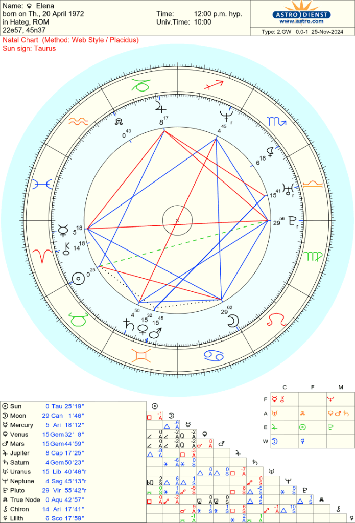 Below you can see the chart of Elena Lasconi born on the 20th of April 1972 in Hateg, Romania. She is a Taurus Sun at 0 degrees, with a Cancer Moon at the 29th anaretic degree and an unknown Ascendant. I was struck by how her Sun and Moon energies, although harmoniously locked into a sextile aspect of friendship and support, are placed at the final and first degrees of the signs they represent! Not only that but what is probably the most fascinating aspect is her North Node in Aquarius at 0 degrees, a destined placement that is at the moment perfectly conjunct transiting Pluto! When Pluto comes calling on the point of your growth in this lifetime, this means that you are being led down the path of a deep mind-body-and-soul transformation. This placement also shows that with the proper support from the collective (Aquarius), Elena is destined (the North Node) to gain great power (Pluto). But it also shows that she is more emotionally more charged up (Moon at the 29th destroying degree), rather than she is able to balance her emotions under the cool light of reason and successful action (Sun at 0 degrees).