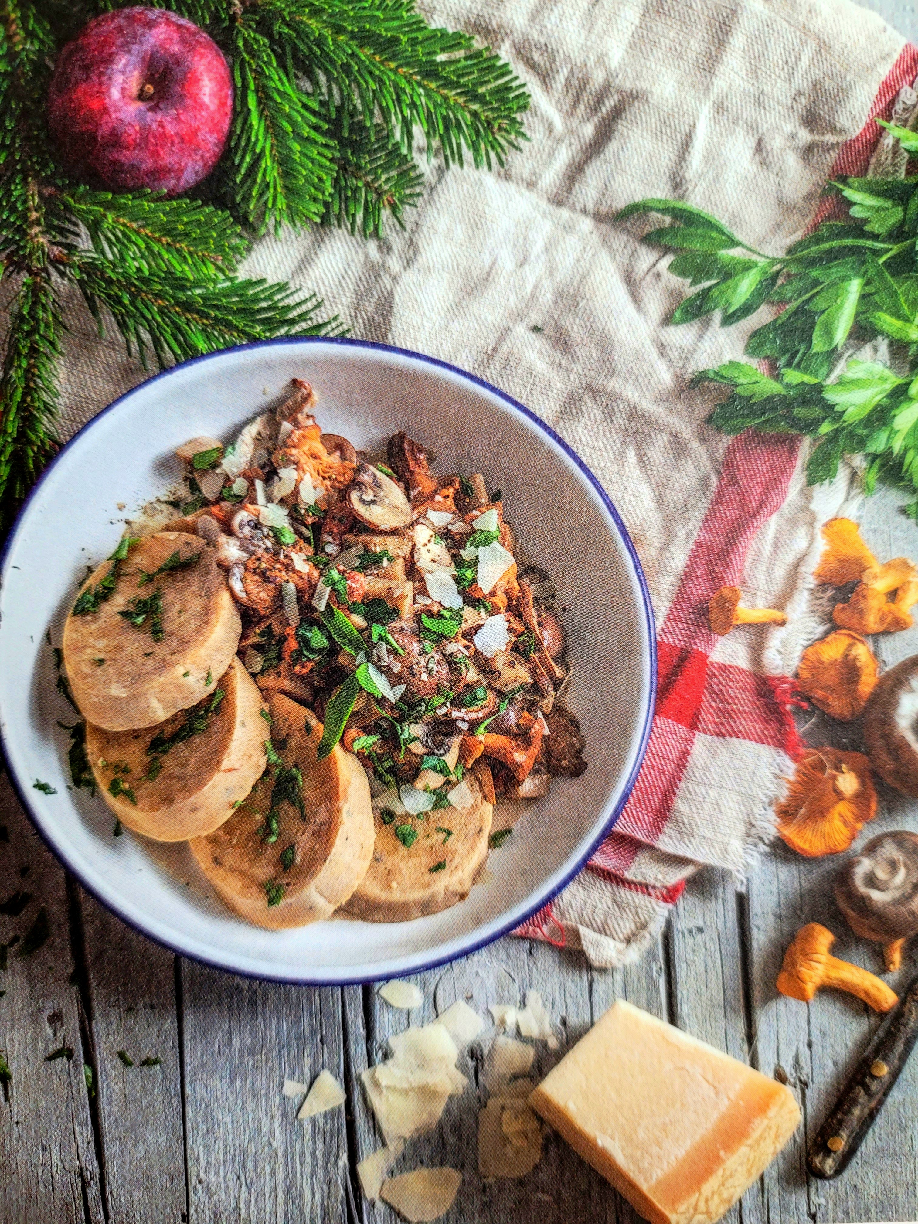 Mushroom Ragout with Bread dumplings – Finely dice the bread roll. Transfer to a bowl. Whisk the eggs and salt to taste with the milk. Pour the mixture over the bread. Finely chop the onion. Melt the butter in a frying pan over medium heat and sweat the onion until softened. Add the onion to the bread mixture and combine well. Leave to rest for 1 hour. Shape the mixture into a thick sausage and wrap tightly in a wet cloth napkin or clean tea towel. Tie the roll securely with twine. Bring a saucepan of salted water to the boil, add the wrapped roll and simmer gently for 40 minutes. For the mushroom ragout, carefully clean the mushrooms. Cut any small mushrooms in half and slice any larger ones. Peel and finely dice the shallots. Heat the oil in a frying pan. Add the shallots and sweat until translucent. Add the mushrooms and fry over high heat, stirring continuously, until beginning to soften. Reduce the heat to low. Pour in the cream and simmer, uncovered for 10 minutes. Add the parmesan just before the end of the cooking time. Season with salt and pepper. Rinse the parsley, pat dry and finely chop the leaves. Stir into the ragout. remove the dumpling roll from the saucepan and drain well. Unwrap and cut the roll unto thick slices. Drizzle with the melted butter, sprinkle with chopped parsley and serve with the mushroom ragout.