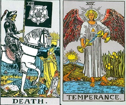 Nature’s cycle of death-rebirth governs the months of November and December. During this period the earthly ego (obsession, sex and the body) and cosmological transcendence (research, spiritual knowledge, overcoming) are important themes which are activated in our collective unconscious. If you live in the Northern hemisphere, this is when the darkness is at its most heaviest on Earth, as the planet completes its movement of revolution around the Sun; on top of this, December also brings with it the Winter Solstice, a powerful energetic portal. Before there were technological and scientifically developments, this season usually inspired artists and craftsmen to intense representations of the battle between light and dark, and the creation of archdemons and archangels. For example, in the traditional Ryder-Waite tarot deck, the Death card which represents Scorpio energy and the Temperance card which represents Sagittarius energy are excellent depictions of these light and dark themes.