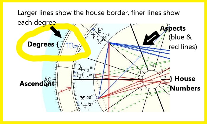 Astrological degrees are the tiny black bars you see on charts. They neatly delineate each house, and are helpeful because they are the hidden keys to grasping your energy: