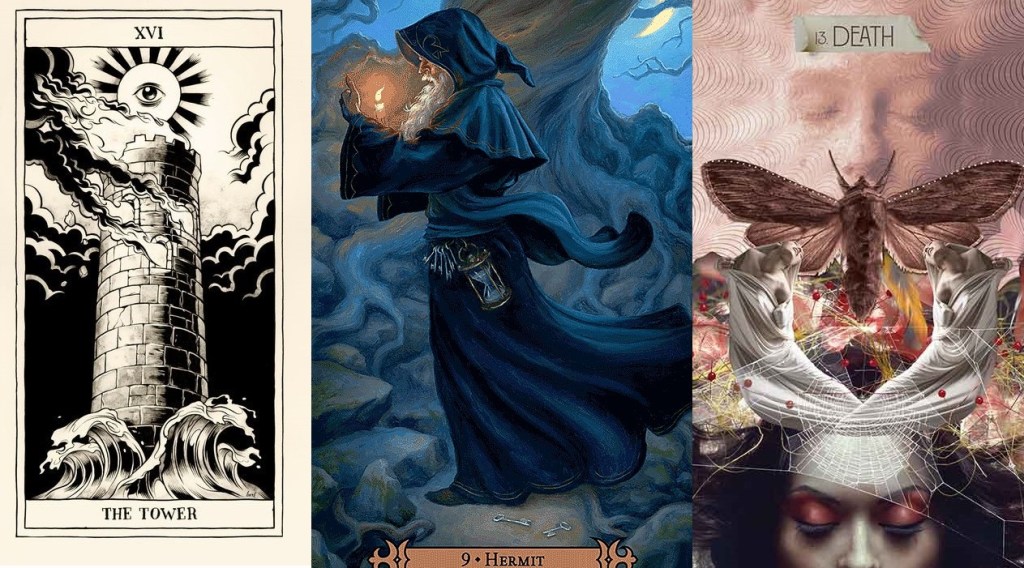 The Tower, The Hermit and Death cards as depicted in various tarot decks