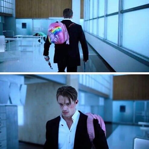 What I liked about the show was Joel Kinnaman’s ironic and mellowed performance of his Alpha male role. For examples, an interesting stylistic choice is to have Takeshi wear a pink Unicorn child’s backpack as he goes around performing toxic, hypermasculinity by shooting aggressors. In a sense, I assume this detail tries to mock the image of the Alpha Male or in a sense humanize him, by showing his attachment to ‘kitsch’, a remnant of the wounded and traumatized little boy narrative that the viewer gets glimpses of as Takeshi has flashbacks from his violent childhood (once again, Freud seems dully appeased in yet another Hollywood script).
