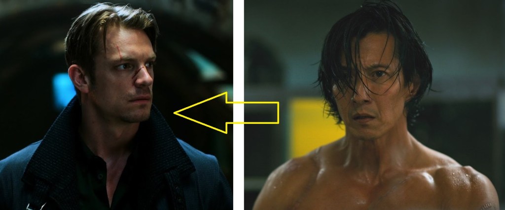 Takeshi goes from his original body sleeve, on the right, to Kinnaman’s one on the left