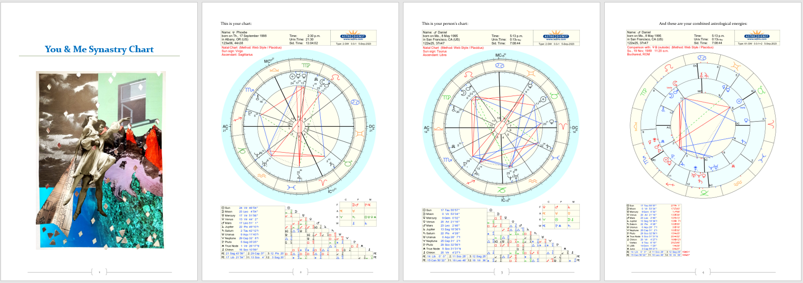 Runele și cărțile de tarot nu te satisfac? Atunci acest raport astrologic de sinastrie este o alternativa excelenta pentru tine! Daca ai vrea sa știi cat de compatibil(a) ești cu partenerul tau romantic, atunci trimite-mi data, ora și locul nașterii, al tau și al persoanei iubite si voi crea pentru tine un raport special (*este necesara ora de nastere a persoanei tale pentru a putea întocmi harta de sinastrie). Raportul complet conține: harta ta astrala, harta persoanei iubite, si harta de sinastrie a voastră (ca in imaginea de jos), urmata de aproximativ 4 spre 5 pagini de analiza sub titlurile ‘Calitatile voastre principale’, ‘Aspectele Problematice ale Cuplului’, ‘Nivelul de Compatibilitate Astrala’. Raportul poate fi adaptat pentru copii tai, prieteni și membrii ai familiei, dacă vrei sa înțelegi mai bine relațiile pe care le ai cu ei, dar e bine de știut ca pot realiza doar 2 hărți astrale per raport. Permite-mi te rog o săptămâna sa iți creez raportul de sinastrie din momentul achitării invoiceului xxx